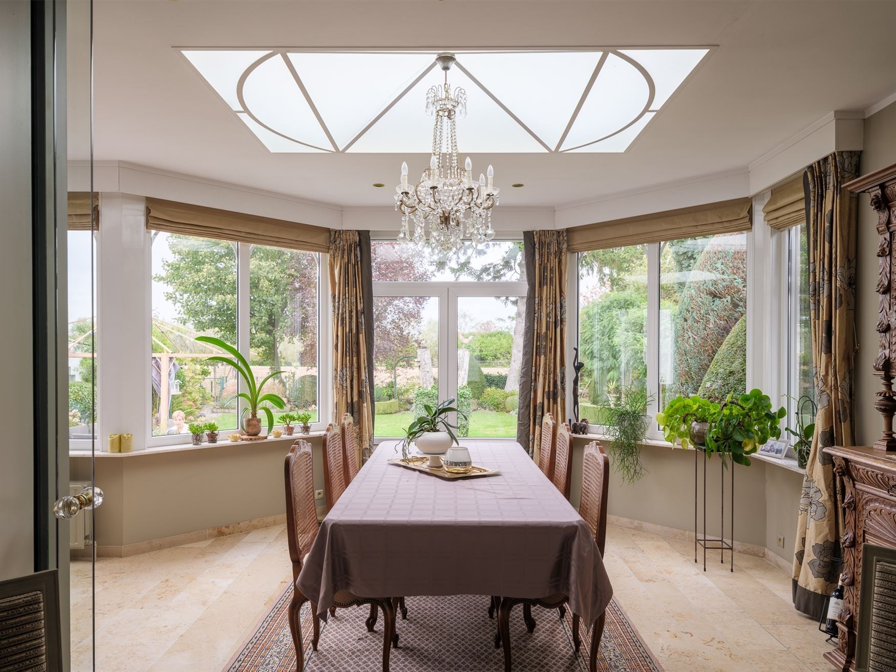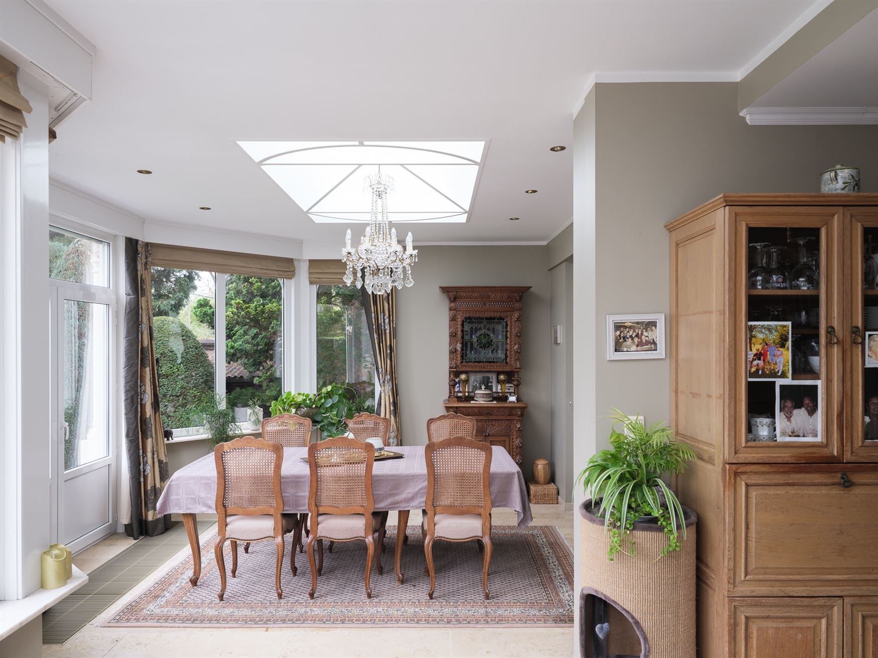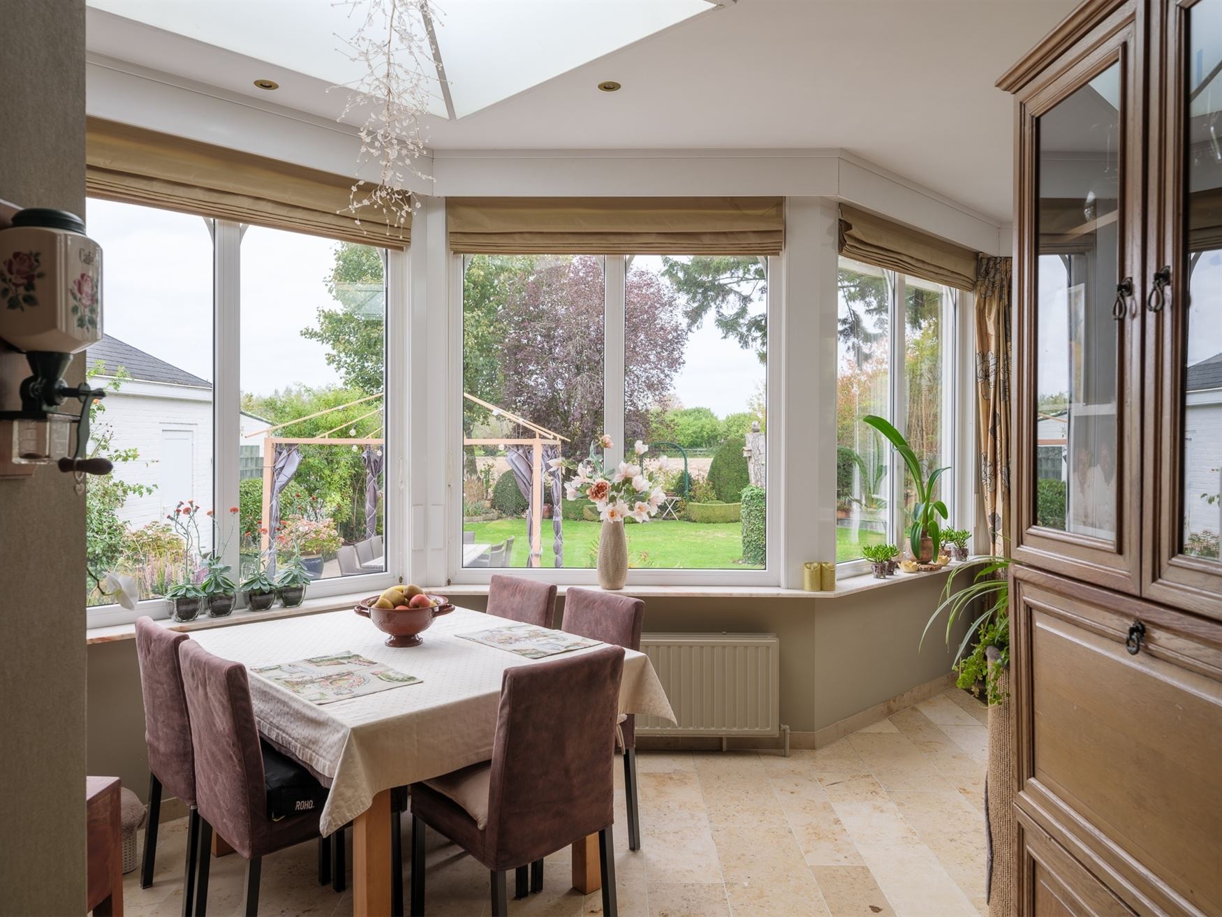 De inkomhal met ingemaakte kasten leidt naar de ruime living met eet- en zithoek, waar elegantie en gezelligheid samenkomen. De aansluitende veranda vormt het hart van de woning: een sfeervolle plek met panoramisch zicht op de smaakvol aangelegde tuin; de ideale ruimte om te genieten van elk seizoen. De afzonderlijke keuken is praktisch ingericht. Verder zijn er op het gelijkvloers een nachthal, gastentoilet, wasplaats en een extra kamer, perfect geschikt als bureau of slaapkamer.