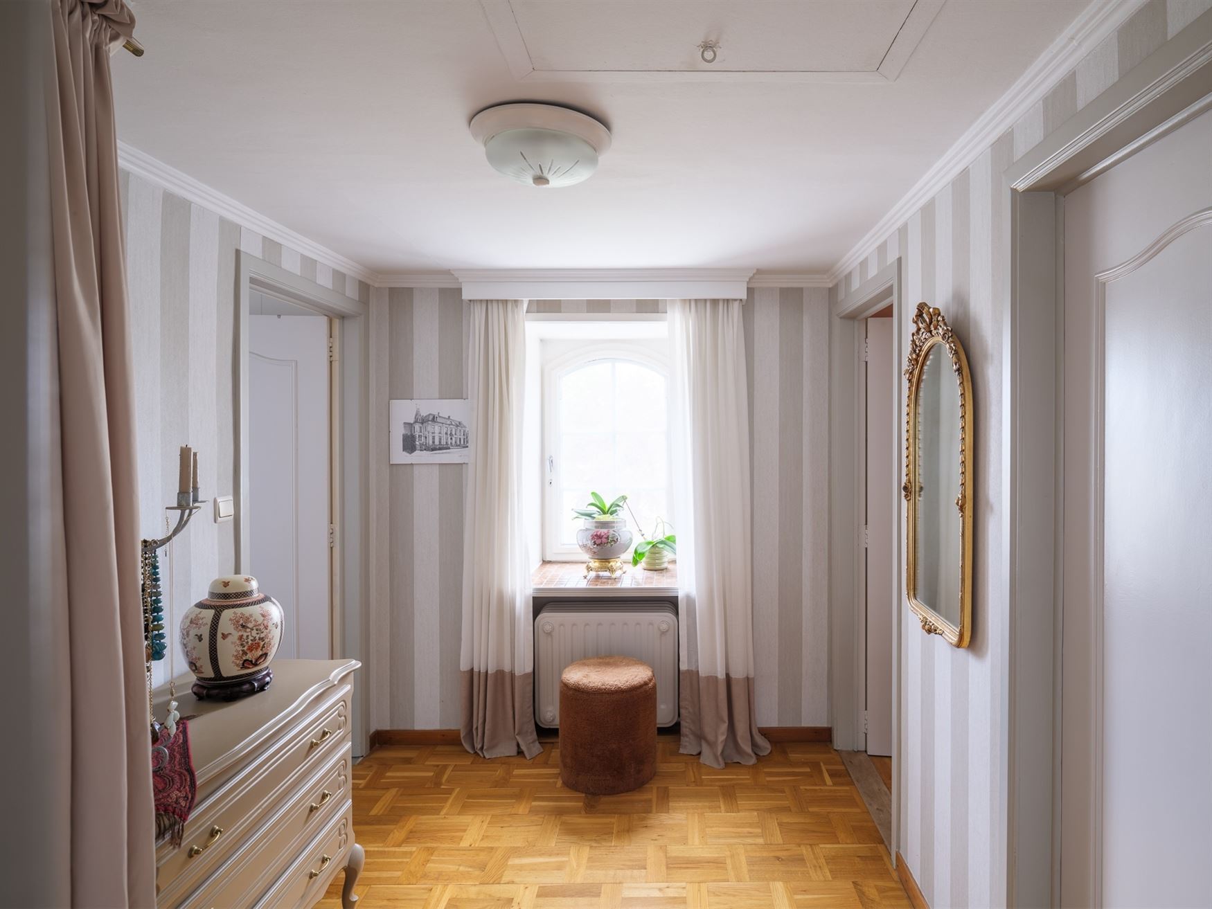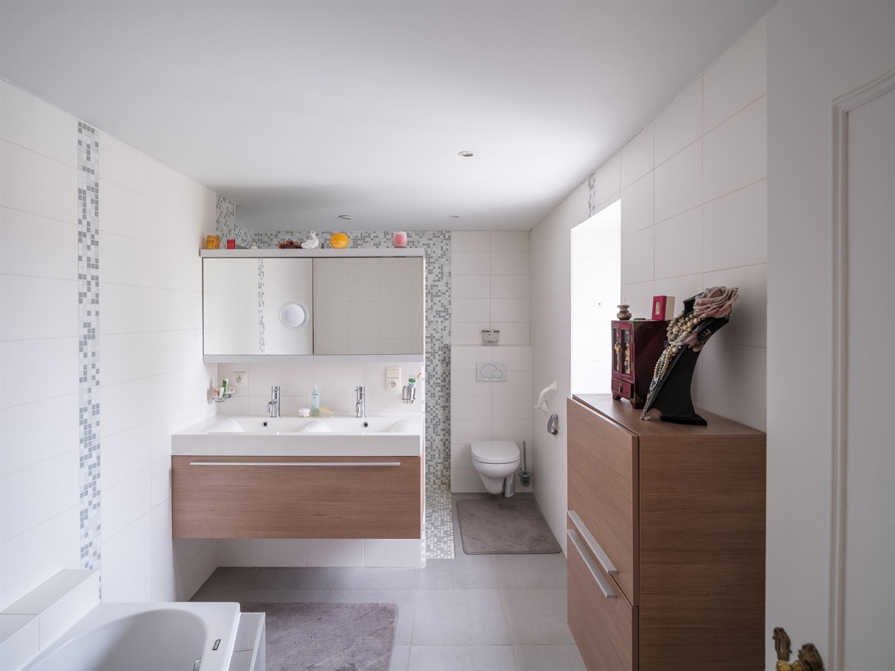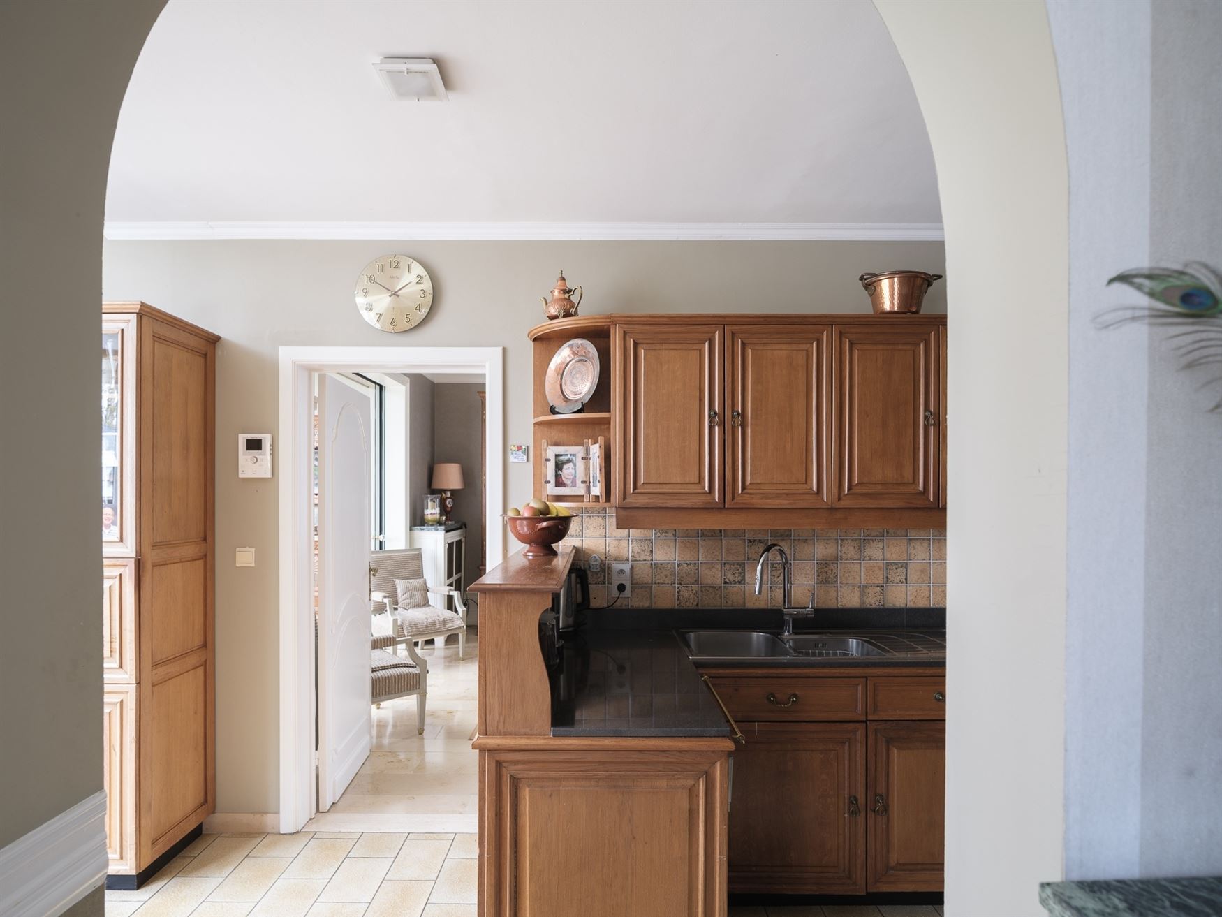 De inkomhal met ingemaakte kasten leidt naar de ruime living met eet- en zithoek, waar elegantie en gezelligheid samenkomen. De aansluitende veranda vormt het hart van de woning: een sfeervolle plek met panoramisch zicht op de smaakvol aangelegde tuin; de ideale ruimte om te genieten van elk seizoen. De afzonderlijke keuken is praktisch ingericht. Verder zijn er op het gelijkvloers een nachthal, gastentoilet, wasplaats en een extra kamer, perfect geschikt als bureau of slaapkamer.