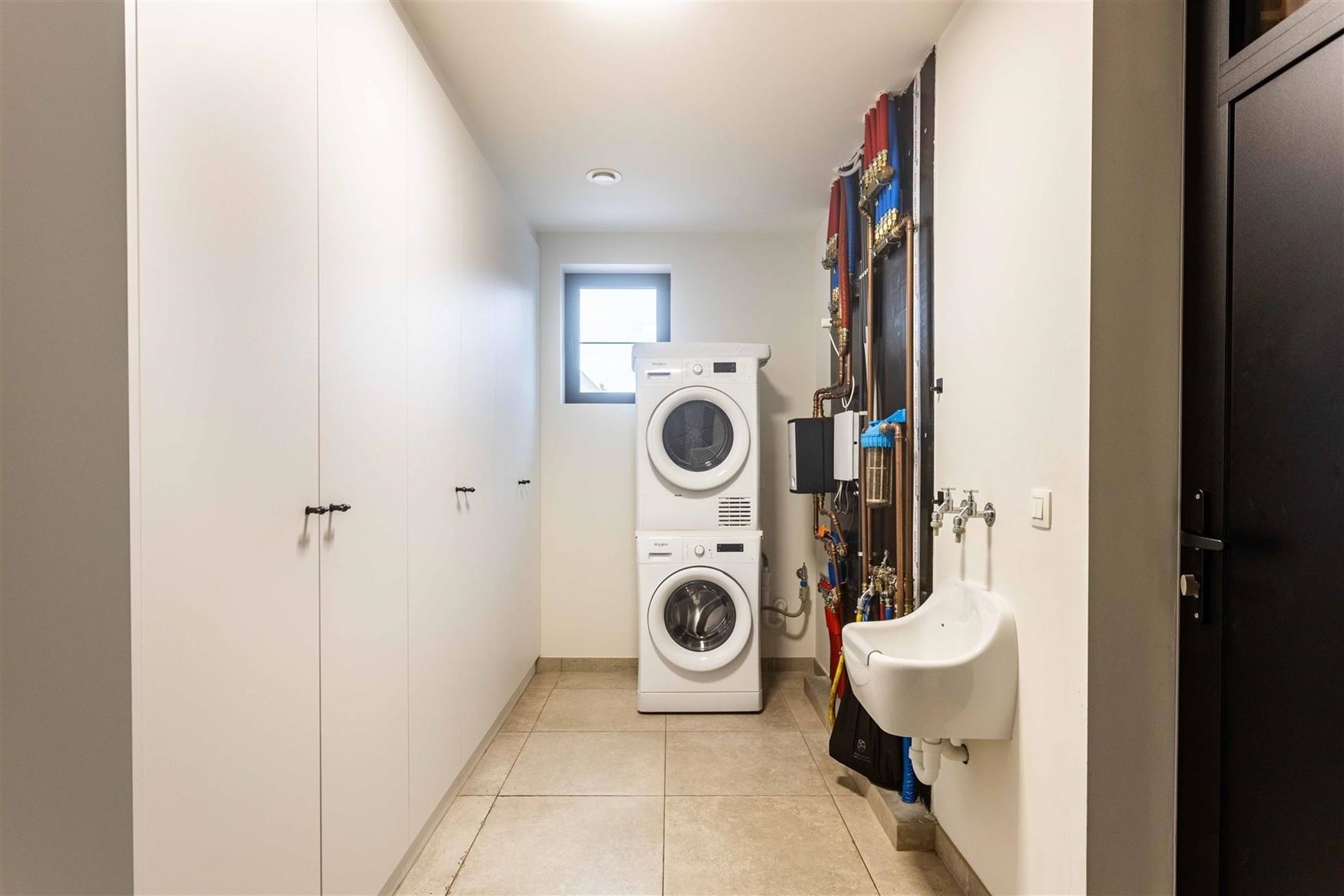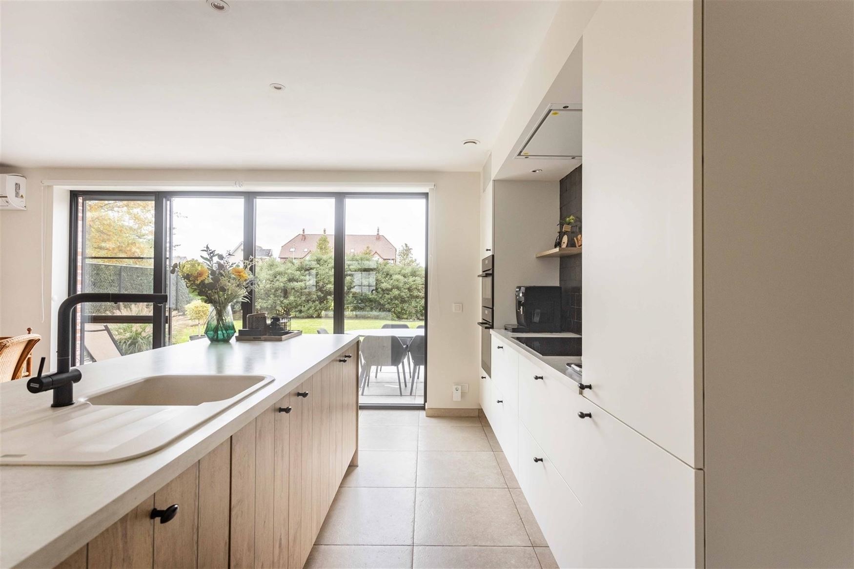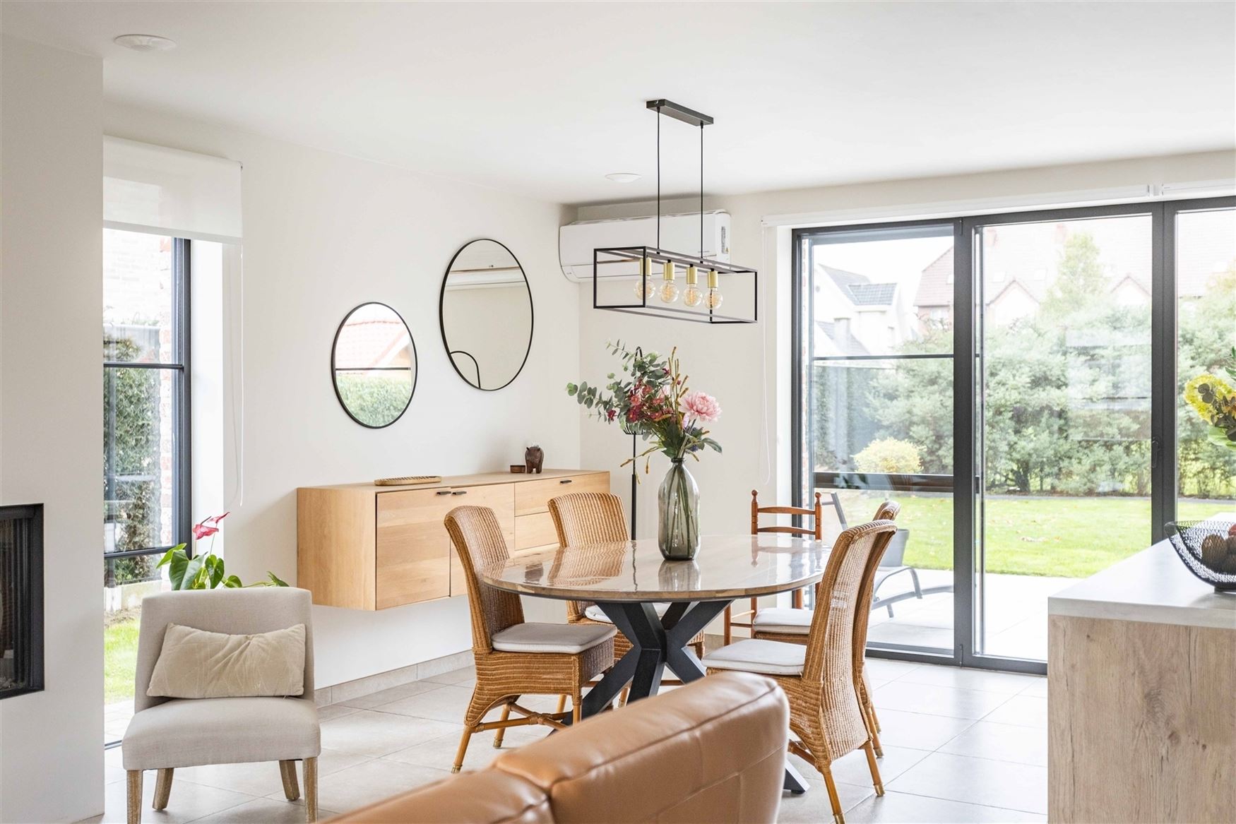 Binnenin verwelkomt een strakke inkomhal met gastentoilet en handige berging onder de trap je in een stijlvol en licht interieur. De leefruimte baadt in het licht dankzij de grote raampartijen en schuifdeur richting de zuidwest georiënteerde tuin. De open keuken met kookeiland is volledig uitgerust en afgewerkt met kwaliteitsvolle materialen. Aansluitend bevindt zich de gezellige eet- en zithoek, waar de gashaard zorgt voor extra sfeer.