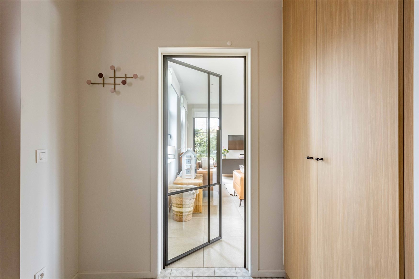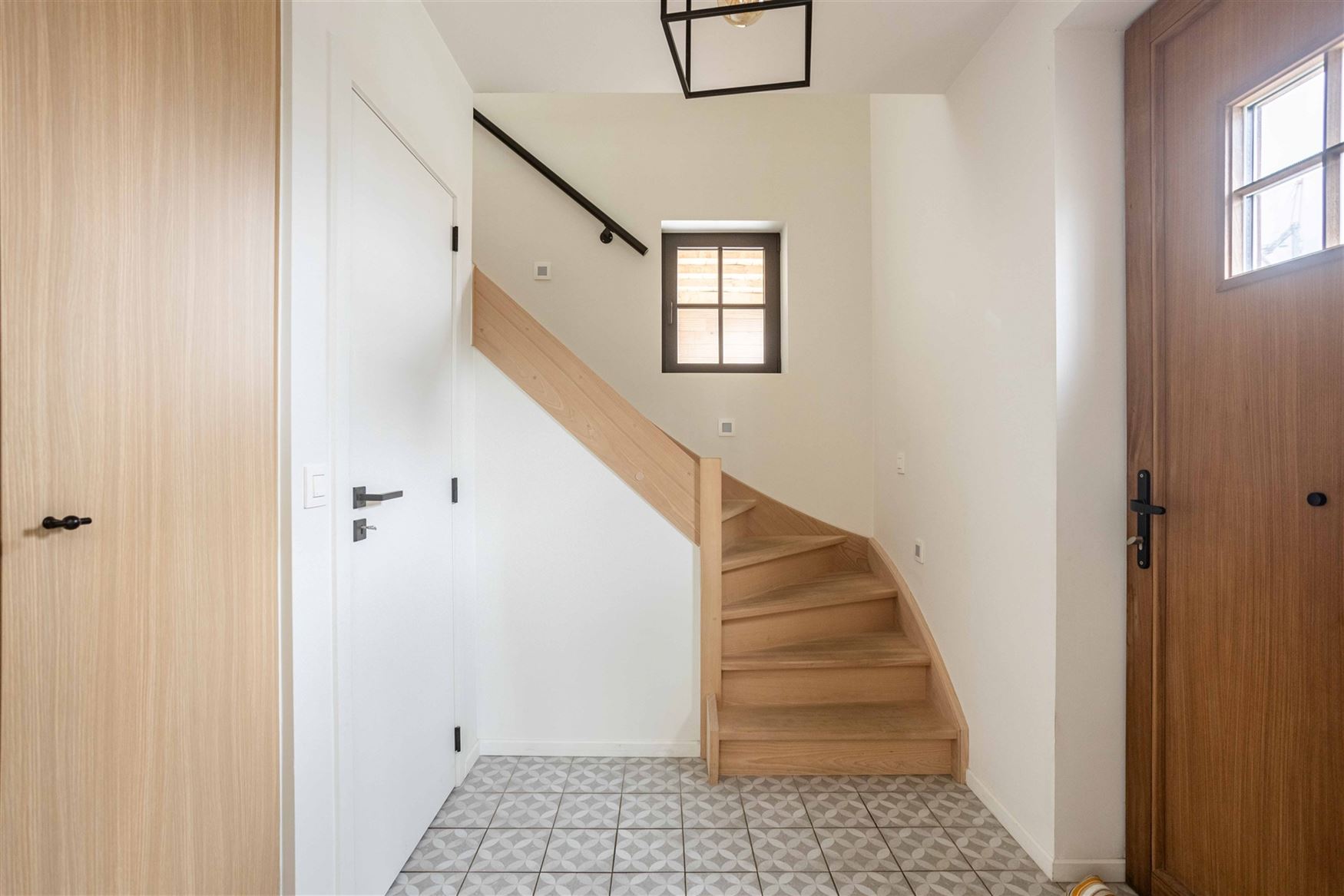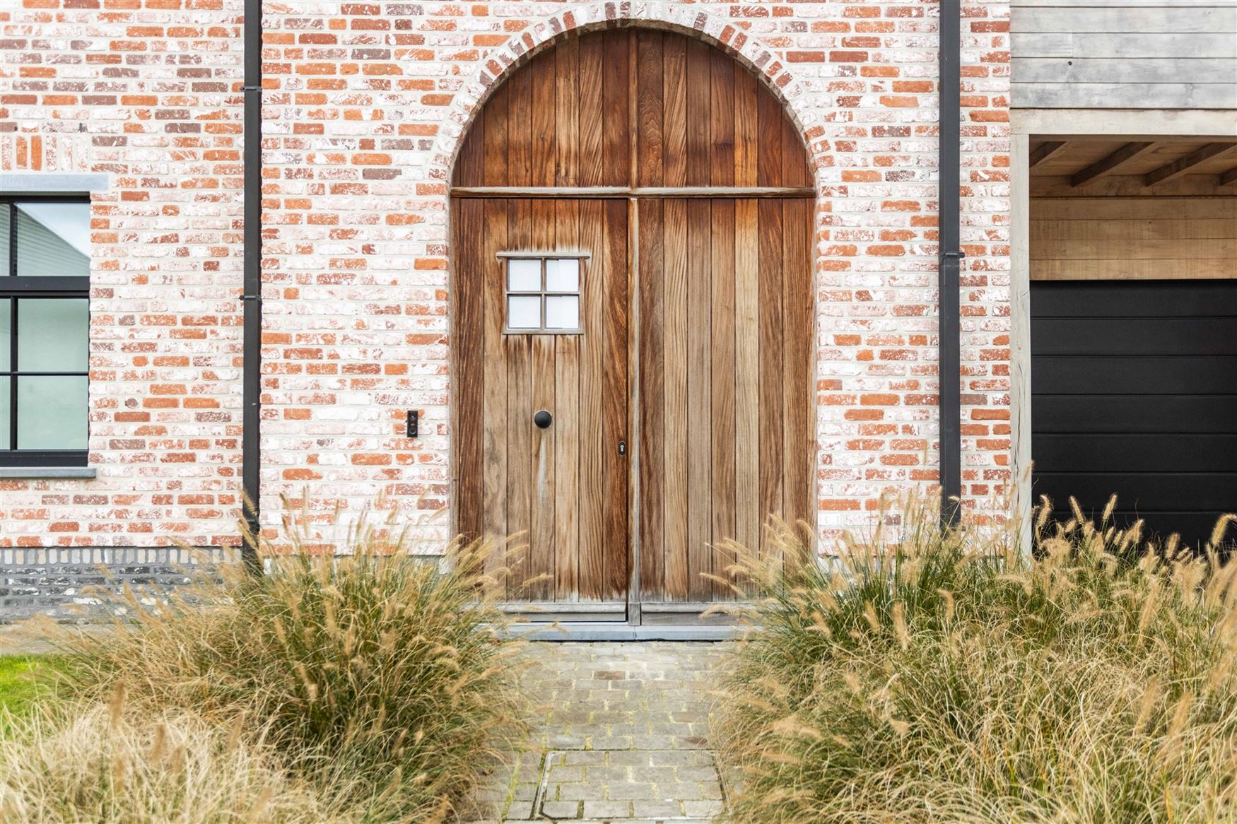 Bij aankomst valt de prachtige gevel in karaktervolle rode baksteen meteen op, aangevuld met zwarte ramen en een indrukwekkende houten inkomdeur. De woning beschikt over een garage en een extra staanplaats vooraan.
